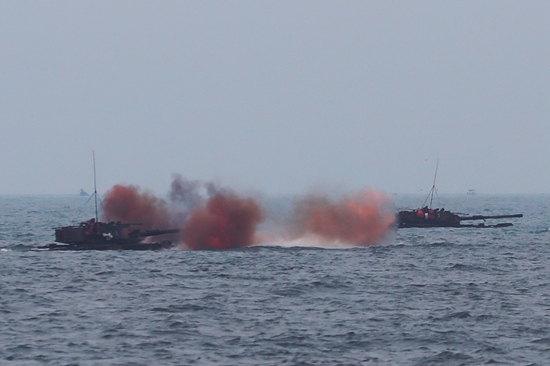 近日,东部战区陆军某合成旅在东南某海域,组织两栖坦克分队开展海上战斗射击考核,检验部队实战能力。图为坦克海上运动射击。