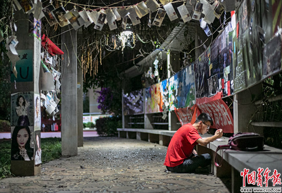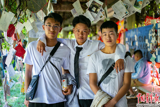教学楼前的文化长廊里挂满了学生互写的高考祝福。这里有印着库里、蔡徐坤、迪丽热巴或是海贼王的卡片,也有清华、北大等名校的明信片,甚至还有写满祝福话语的大横幅。有一些则是匿名的留言,清秀的字迹中透着懵懂的情愫。