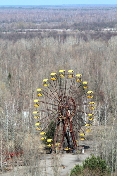 普里皮亚季的必游之处是一座摩天轮。它黄色的外观是萧条景象中难见的一抹亮色。计数器贴近摩天轮的座舱,会测出辐射数值超标4万倍。这座摩天轮命运多舛:原计划在1986年5月1日正式开放,开放日的4天前,爆炸发生了。爆炸次日,它只临时开放了几个小时。