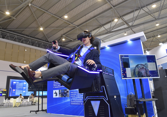 6月11日,一名参观者在体验“极限飞行”座椅。6月10日至12日,2019成都全球创新创业交易会在成都举行,一系列科技产品亮相此次交易会,吸引众多观众前来参观体验。