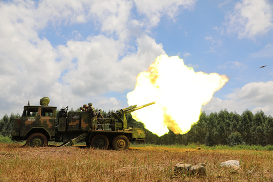 7月23日,第75集团军某旅在桂南地区展开炮兵实弹射击演练,通过设置空地火力协同难题,检验提升地面炮兵分队在空中火力协同下的精确打击能力。崔淞柔/摄