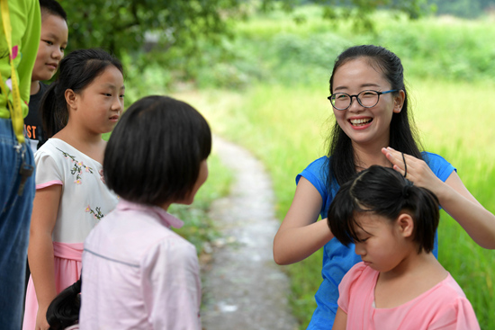 在江西省南昌市湾里区罗亭镇曹家村,上坂小学校长涂悠悠在为孩子扎辫子(9月2日摄)。2013年从师范专业毕业后,涂悠悠做过培训机构助教、也从事过社区工作,但当老师一直是她的梦想。2016年,她参加了江西省教师招聘统一考试,成为一名乡村教师。如今,29岁的涂悠悠已经是上坂小学的校长。新华社记者 彭昭之/摄