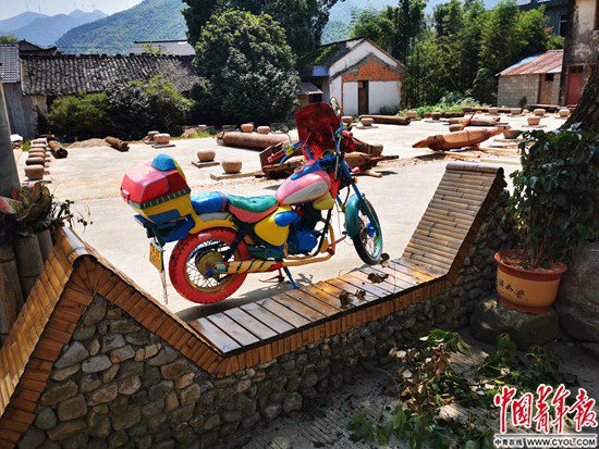 但在这个相传已有千余年历史的村庄,它是第一件被外人称为“艺术品”的公共设施。为了装饰它,村民还拉来了一辆早已报废的摩托车,用油漆把它涂得五彩斑斓,摆在椅子旁边。