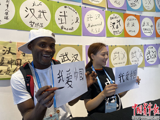 据工作人员透露,经常会有各国运动员过来体验,希望教他们写中文名字、尝试练习毛笔字已经成为很多运动员在军运村的娱乐方式。来自尼日利亚的跆拳道运动员Awoyele Olakunle主动挑战4个汉字“我爱中国”,他对中国青年报·中国青年网记者表示,军运村里自由、友爱的氛围让他感到惬意,“我来自尼日利亚,那里偶尔有战乱,因此,我渴望和平,渴望找到能实现和平的地方。”