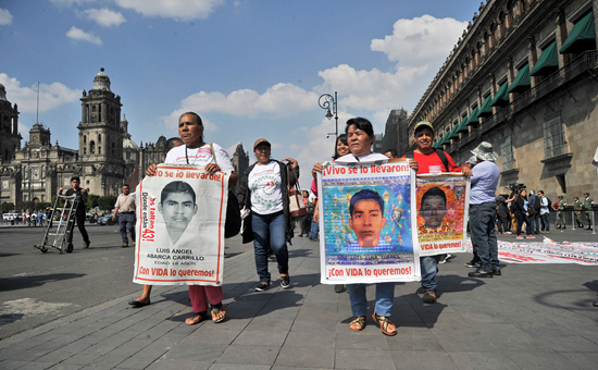 当地时间11月11日,墨西哥墨西哥城,亲属们在会见墨西哥总统奥夫拉多尔后展示失踪学生的头像。墨西哥政府此前宣布,将重启调查2014年“43名学生失踪案”。2014年9月26日晚,墨西哥南部的格雷罗州发生暴力事件后,43名学生下落不明。视觉中国供图