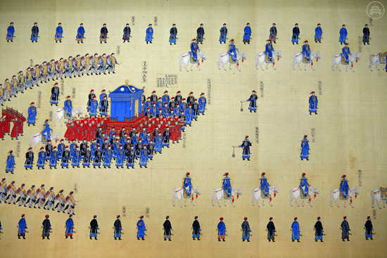 卤簿是皇帝为表祭天之隆重在举行祭天仪式时列出的仪仗队。魏晋时期,祭天仪仗被称为大驾卤簿。清乾隆十三年(1748年),乾隆帝钦定祭天仪仗使用金辂、玉辂、木辂、革辂和象辂,合称“五辂”,与法驾卤簿、骑驾卤簿、銮驾卤簿合为大驾卤簿,专门用于祭天典礼。大驾卤簿中有百官、侍卫、太监等人员共3700余人,乐器、兵器、车辂、旗、帜、幡等各种器具1000余件。大驾卤簿绵延数里,浩荡壮观。