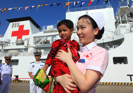 2010年,孟加拉一名患有心脏病的孕妇即将生产,向“和平方舟”求助。医护人员全力抢救,将母女从死亡线上拉回,年轻的父亲决定给仅3斤重的女儿取名“Chin”,这个名字孟加拉语意为“中国”。