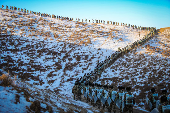 12月24日,武警甘肃总队新训三大队组织新兵在海拔3500米的雪域高原进行为期3天的冬季野营拉练。新战士们翻丘陵、过险坡,在甘南高原穿插进行队形变换、急行军、防暴弹投掷和抢占坡顶等课目训练,全面锤炼了严寒条件下“走、打、吃、住、藏”等行军作战能力。侯崇慧/摄