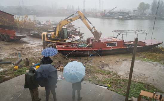 位于长江中游的湖北省洪湖市螺山镇长江捕捞村阴雨绵绵,起重机、挖掘机、切割工具发出的轰鸣声不绝于耳,57岁的渔民夏明星看着他祖祖辈辈谋生的家伙什——一艘10多米长的铁制渔船被拆解,久久不愿离去,眼里不自觉地泛起了泪花。