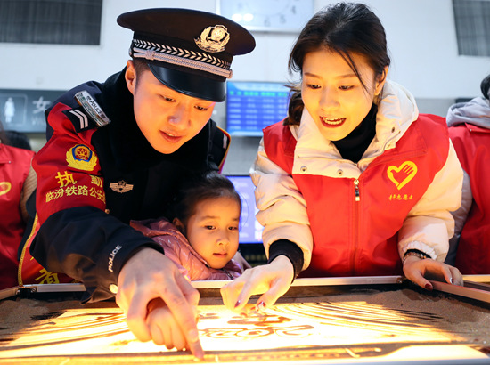 临汾西站,青年志愿者正和一名候车的小朋友一起在沙画上画出对新春的美好祝福。近日,为营造“平安春运、有序春运、温馨春运、让旅客体验更美好”的浓厚氛围,山西临汾铁路公安处民警深入管内各站,开展写春联送祝福、志愿服务、普法宣传等便民活动。王建良/摄