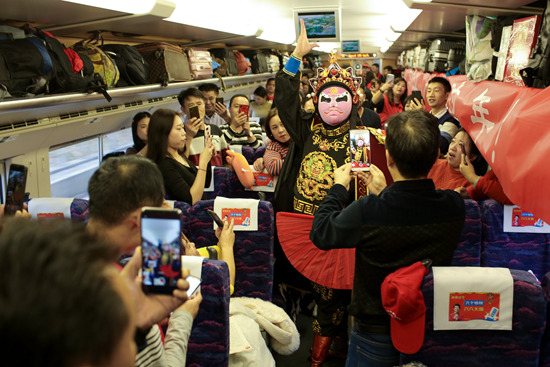 1月17日,从广州南站出发的D1822次列车上,来自四川省内江市资中县木偶剧团的志愿者表演川剧变脸。这趟由团内江市委、邮储银行内江市分行开通的“团团接你回家”返乡专列,载着近千名在粤务工、学习的内江老乡回家过年。汪龙华/摄