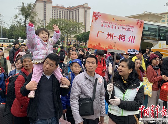 1月19日,团广州市委联合市委宣传部、市文明办、市来穗局等组织的2020年暖冬行动“花城有爱·冬日暖阳”春运直通车启程了,满载着640名来穗务工人员、在穗求学青年的13辆大巴车将开往不同的返乡城市。中青报·中青网记者 林洁/摄