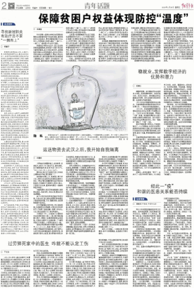 疫情防控的当下,全国范围内发生多起涉疫情个人信息泄露事件。一方面要保障公众知情权,另一方面个人隐私权不可漠视。这要求执法部门在具体执法中掌握好“度”。2月24日,司法部发布意见,要求疫情防控措施要与疫情可能造成的社会危害的性质、程度和范围相适应,尽量最小程度地减损公民权益。(《工人日报》2月27日)漫画:徐简