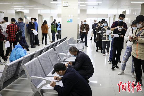 4月12日,湖北省中医院光谷院区,人们排队参加返岗体检。在做好登记、预检分诊后,他们将陆续到相应检查区域排队等候体检。中青报·中青网记者 赵迪/摄
