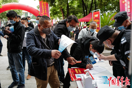 4月21日,武汉经济技术开发区,在2020年复工复产企业首场现场招聘会上,求职者在测量体温和登记个人信息。这是春节后武汉人力部门举办的首场线下招聘活动,共设7个分会场,涉及食品、医药、物流等行业。当天,参会企业共281家,提供就业岗位1万余个,吸引7200余名劳动者进场求职,其中3000多人现场签约或达成就业意向。中青报·中青网记者 赵迪/摄