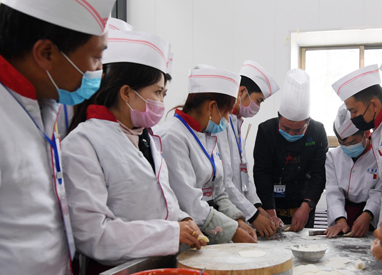 4月21日,在东乡县职业技术学校,中式烹饪培训班学员学习制作包子。近年来,“三区三州”深度贫困县——甘肃省临夏回族自治州东乡族自治县,针对当地18至45周岁的建档立卡贫困户、青壮年劳动力等群体,实施免费就业技能培训工程,开设牛肉拉面、中式烹饪、美容美发等技能专业。新华社记者 范培珅/摄
