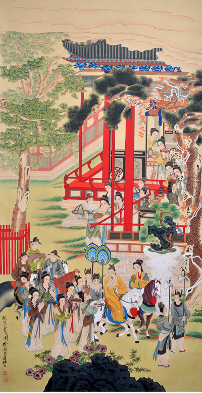 生性热闹的唐玄宗此时常携妃游幸芙蓉园,并引领时尚潮流。《开元天宝遗事》曾载玄宗亲手插花宠妃:御苑新有千叶桃花,帝亲折一枝插于妃子宝冠上,曰:“此个花尤能助娇态也”。把鲜花插在美女头上能助长女性的娇艳和媚姿,一时插花之风盛于长安。