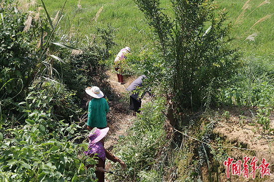 在一段视频里,这支队伍中女人们穿着围裙、男人们穿着长袖,戴着草帽,弯着腰“割草清杂”。官矛草一棵一棵倒下,灌木从根部被铲掉。小路年久失修,在上下坡处用锄头挖出阶梯。有的地方已被洪水冲垮,堑沟宽处用石头填上,窄的就清理干净附近的杂草,让人们直接就能看到。