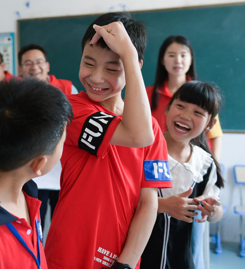 7月21日,在余姚市小曹娥镇的辛慧学校暑期乐园里,孩子们在志愿者的带领下玩“默契传递”的趣味游戏。