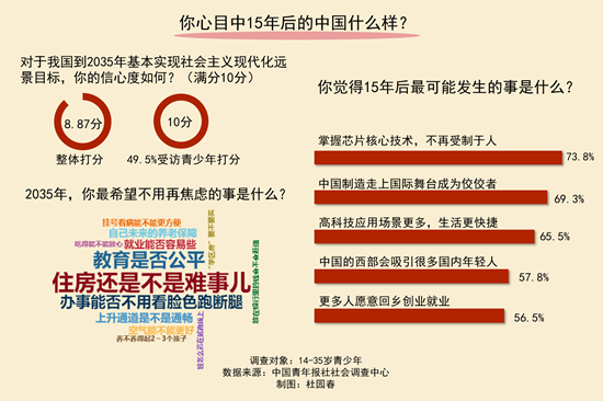 党的第十九届中央委员会第五次全体会议中,提出了到2035年基本实现社会主义现代化远景目标。会议中提出的一系列重大政策举措,事关国家与个人的发展。广大青少年是2035年远景目标实现的主力军,他们眼中15年后的中国是什么样?