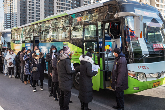 1月11日,河北省三河市燕郊镇,证件复检和登记完毕的乘客排队准备乘车进京。侯帅/摄