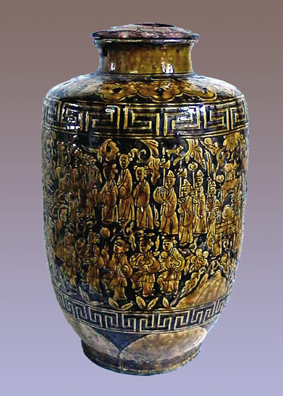 马口窑陶器上的装饰,最有特色的人物题材有3种纹饰。它们是 “八仙坛”“状元打马游街坛”“十八学士坛”。“状元打马游街坛”高约47厘米,宽约24厘米,口径约14厘米。整件器物拉坯成形,施白色化妆土后采用刻划手法作满地装饰,然后用透明灰釉浸罩一层,经龙窑还原气氛烧成之后呈黄绿褐色透明釉面。色调深沉,稳重而明亮。