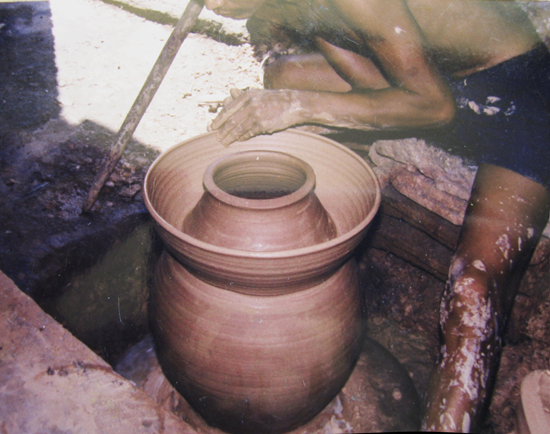 明代以后,管家窑手工制陶吸收了当地比较盛行的剪纸贴花装饰技法和纹饰内容,出现了刻划花工艺,初步形成了自己特有的艺术风格。20世纪80年代初,除了李窑用泥条盘筑大缸的方法外,蕲春三大窑场在制陶成型工艺上有着相同的方法,都是采用木棍搅动泥质辘轳轮盘拉坯成型为主,拉坯是陶瓷手工成型的诸多方法中成型速度最快的一种,最符合民间陶瓷批量生产的要求,它还能保证同一种类产品的规范性、统一性。