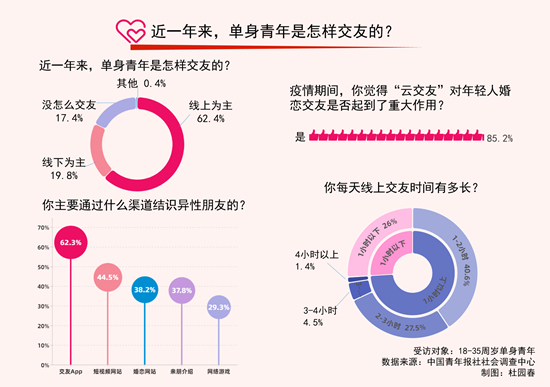 日前,中国青年报社社会调查中心联合问卷网(wenjuan.com),对2001名18-35岁单身青年进行的一项调查显示,62.4%的受访单身青年近一年来交友以线上为主,交友App、短视频网站、婚恋网站是三大渠道。85.2%的受访单身青年感到,疫情期间,“云交友”对年轻人婚恋交友起到了重大作用。