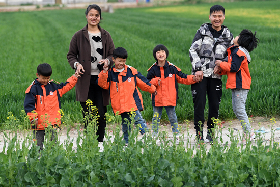 春节过后,趁着还未开工的这段时间,安徽省阜阳市阜南县朱寨镇五井村村民常胜和妻子朱成珍常带着四胞胎子女在村里的小广场上玩耍、在屋后的田野里嬉戏。看着4个孩子健康快乐地成长,常胜夫妻脸上写满了幸福。
