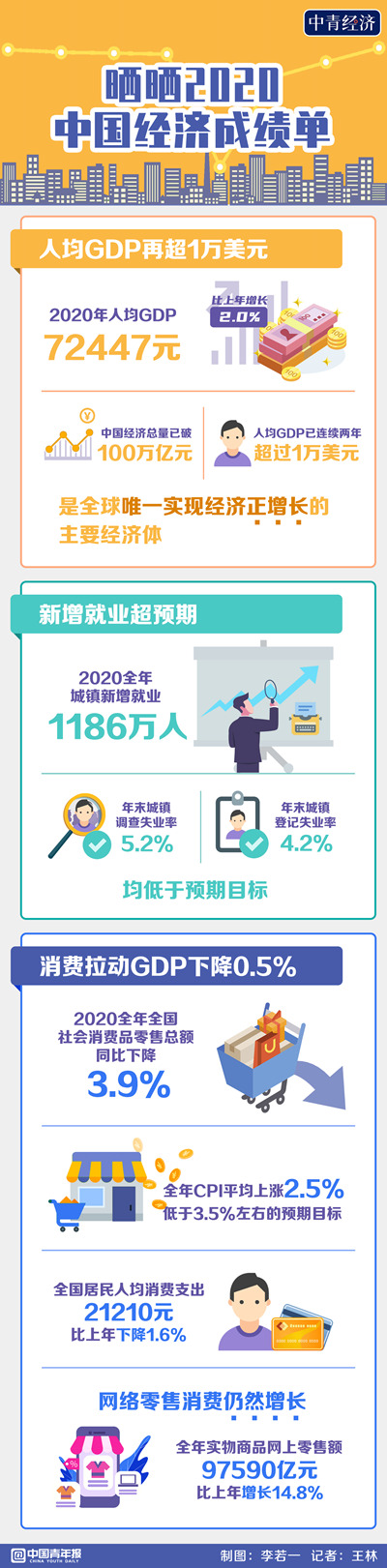 2月28日,国家统计局发布《2020年国民经济和社会发展统计公报》。这份中国经济的“综合评价表”显示,2020年国内生产总值(GDP)达101.6万亿元,比上年增长2.3%;人均国内生产总值72447元,比上年增长2%。