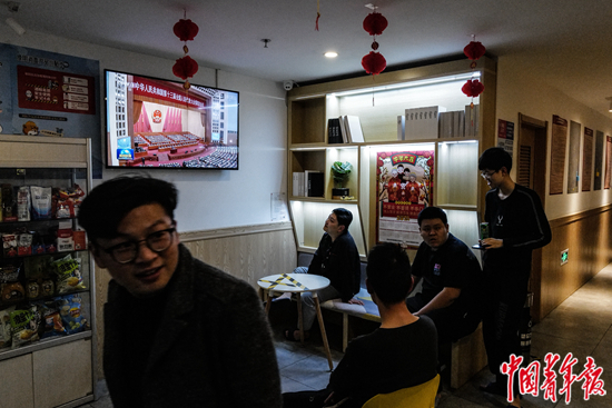 3月5日,北京市朝阳区十里河,几个年轻人在安歆公寓里观看新闻联播,里面播放着两会相关报道。这个长租公寓里住着620人,以年轻人为主,他们有快递小哥、停车管理员、餐饮服务员等。当日,十三届全国人大四次会议在北京开幕,国务院总理李克强作政府工作报告。政府工作报告中提到,规范发展长租房市场,降低租赁住房税费负担,尽最大努力帮助新市民、青年人等缓解住房困难。中青报·中青网记者 赵迪/摄