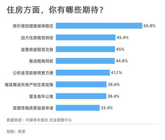 住房一直是社会关注的焦点问题。今年的政府工作报告再提“房住不炒”,提出要解决好大城市住房突出问题。中国青年报社社会调查中心进行的“2021全国两会青年期待”调查显示,在住房方面,65.8%的受访者希望房价调控措施保持稳定,45.4%的受访者期待加大住房租赁供给,让人们更容易租到房。