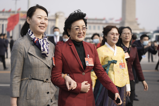 3月8日,十三届全国人大四次会议在北京人民大会堂举行第二次全体会议。这是女代表们走向会场。 新华社记者 李贺/摄