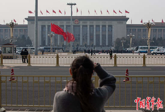 3月8日,北京天安门广场,十三届全国人大四次会议第二次全体会议即将开始,一位女游客驻足遥望人民大会堂前参会的代表、委员。中青报·中青网记者 李峥苨/摄