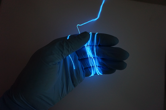 在复旦大学实验室,记者见到了这些会发光的丝线。这些直径不足半毫米的纤维材料颜色各异,看上去与生活中的寻常纱线没有区别。但当它们通上电后,就显示出了独特的一面——会发出明亮的光,且可以控制。