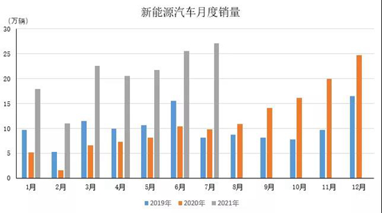 统计数据显示,今年7月,新能源汽车产销分别达到28.4万辆和27.1万辆,市场呈现出“淡季不淡”的特点,产销环比和同比继续保持增长,且双双创历史新高。考虑到通常下半年才是新能源汽车销售的旺季,2021年新能源汽车销量有极大的概率超出市场预期。