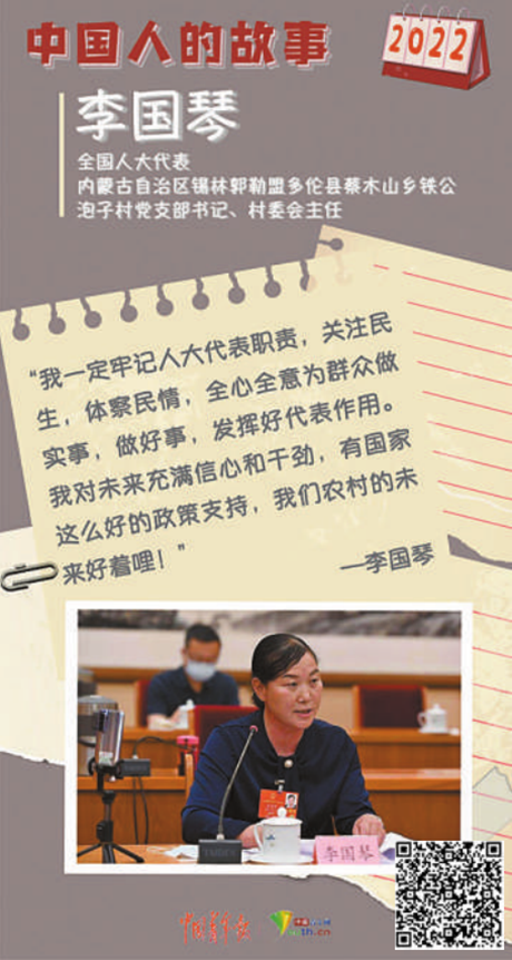 如今百万亩樟子松林郁郁葱葱、茫茫无边。林间能打草,草料不仅足够供自家圈养的牲畜食用,村民还把多余的草料拿去卖钱。此外,李国琴还积极引导村民发展旅游业。“从人民大会堂回到村里,我又有了新计划,我们村的自然资源丰富,不仅有草原、山丘、森林,还有由金莲花和赤芍形成的彩色风景线,再加上辽代贵妃墓、姑娘湖,发展生态旅游,村民们致富的机会多着嘞!”李国琴说。