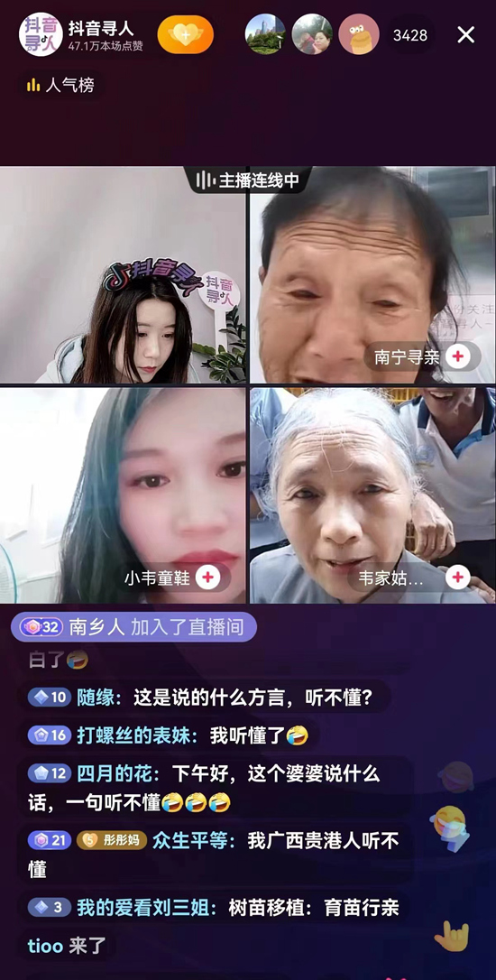 5月10日15时,广西南宁市救助管理站为8名受助人员举办了一场“直播寻亲”活动。这些在外流浪走失多年、甚至言语表达存在障碍的受助人在专业社工的帮助下,通过辨认玉米、辣椒、柑橘等果蔬,做游戏唱歌等方式,在网络直播间与网友互动,为网友确认其身份提供更多线索。