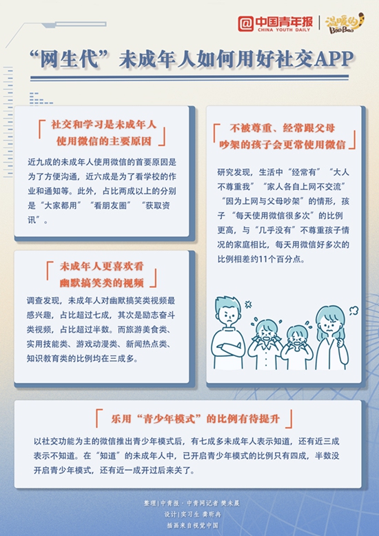 为更好地维护未成年人的合法权益,中国青少年研究中心“未成年人线上社交产品的使用及其权益保护”课题组以微信为例,研究青少年使用微信及其相关功能的特征,分析未成年人使用线上社交产品的作用,以期更好地为未成年人服务,保护未成年人权益。