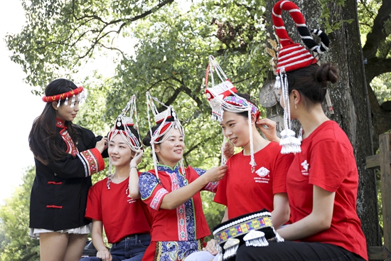 8月9日,浙江杭州桐庐县莪山畲族乡莪山民族村西金坞自然村,来自北京大学2022年“力行计划”研究生暑期社会实践桐庐团的成员们在学做畲乡头饰。由12名硕士生和2名博士生组成的北大实践团将在桐庐各地开展为期1个月的暑期社会实践,体验不同角色转换,增加基层岗位历练,并以自身专业特长,助力地方经济和文化发展。徐军勇/视觉中国