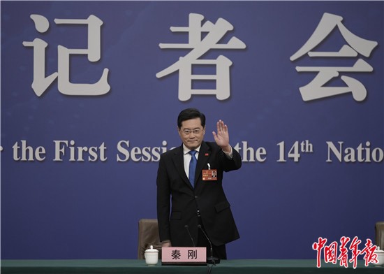 3月7日,北京梅地亚中心,十四届全国人大一次会议记者会上,外交部长秦刚向记者挥手致意。当日,外交部长秦刚就“中国外交政策和对外关系”相关问题回答中外记者提问,这是秦刚就任外交部长后首次参加全国两会记者会。中青报·中青网记者 李隽辉/摄