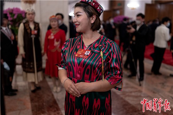 3月5日,北京人民大会堂,十四届全国人大一次会议开幕会结束后,全国人大代表如克亚木·麦提赛地在会场外。她是民族团结模范“库尔班大叔”的曾外孙女,曾经在辽宁舰上服役。中青报·中青网记者 李隽辉/摄