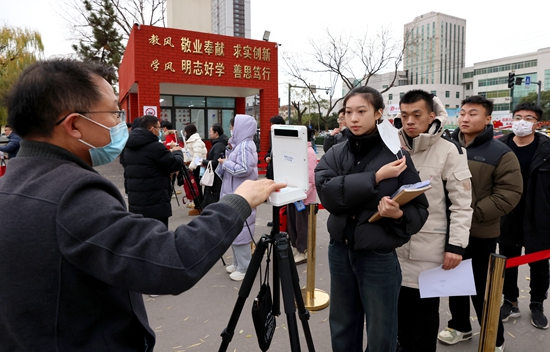 12月10日,在山东省枣庄市第四十一中学南校考点,工作人员在核对考生信息。本周末,多地2024年度考试录用公务员笔试举行。孙中喆/摄(新华社发)