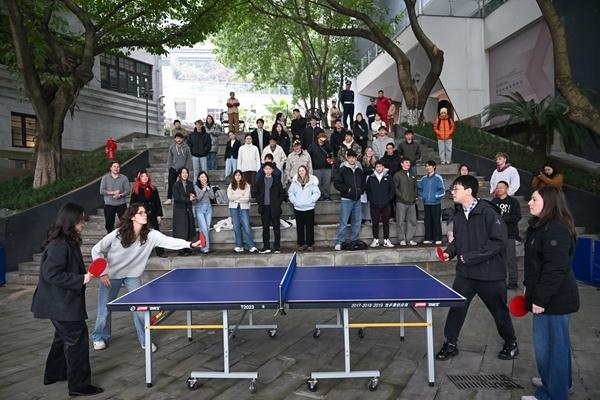 1月16日,中美青年在重庆史迪威博物馆户外平台上进行乒乓球友谊赛。当日,由重庆市人民对外友好协会、史迪威研究中心主办的“共话历史,携手未来——史迪威中美青年桥”主题活动在重庆史迪威博物馆举行。新华社记者 陈诚/摄