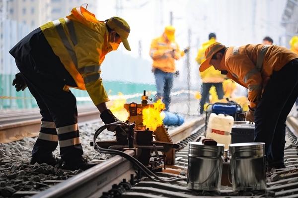 3月16日,铁路职工在京沪铁路南京林场站进行钢轨焊接作业。近日,中国铁路上海局集团有限公司对管内京沪铁路开启了2026年第一阶段集中修施工。南京桥工段、南京电务段组成工电联合作业组,通过道岔大修、线路捣固、轨道电路整治等施工作业,消除线路安全隐患,保障铁路客货运输安全畅通。据了解,本次集中修将持续至4月中旬。苏阳/摄(新华社发)