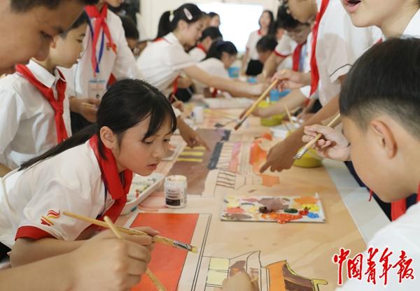 他们所绘的画卷中,有中共一大会址、越中友谊宫等红色地标,有万里长城、天安门、越南文庙、顺化皇城等文化遗产,有复兴号高铁、天宫、越南金桥、地标塔81等两国现代化建设成果,寓意中越两国人文相亲、命运与共、情谊深厚,表达了两国少先队员传承红色基因、共创美好未来的共同心愿。中青报·中青网记者 陈剑/摄