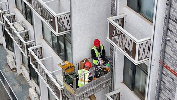 4月12日,湖北房县,城关镇老北街的老旧小区改造主体工程完工,施工技术人员在改装入户网络宽带线路。视觉中国供图