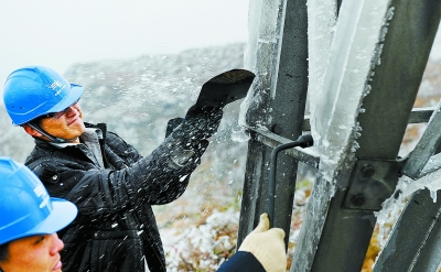 1月6日,贵州省贵阳市花溪区高坡乡,抢险队员去除电塔上的覆冰。 李 勇摄