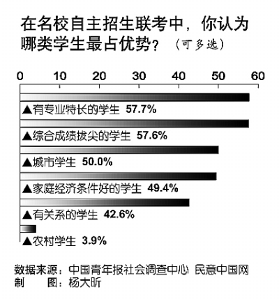 自主招生联考对哪类学生最有利?调查中,50.0%的人选择“城市学生”,仅3.9%的人选择“农村学生”。受访者给出的其他选择为:有专业特长的学生(57.7%)、综合成绩拔尖的学生(57.6%)、家庭经济条件好的学生(49.4%)、有关系的学生”(42.6%)等。