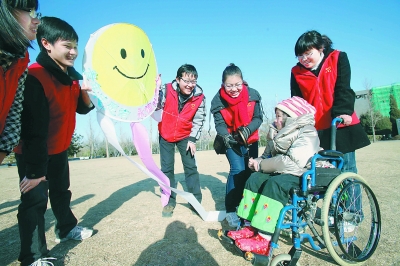3月1日,北京化工大学学生志愿者与北京市朝阳区和平街街道辖区的残疾儿童一起放风筝。